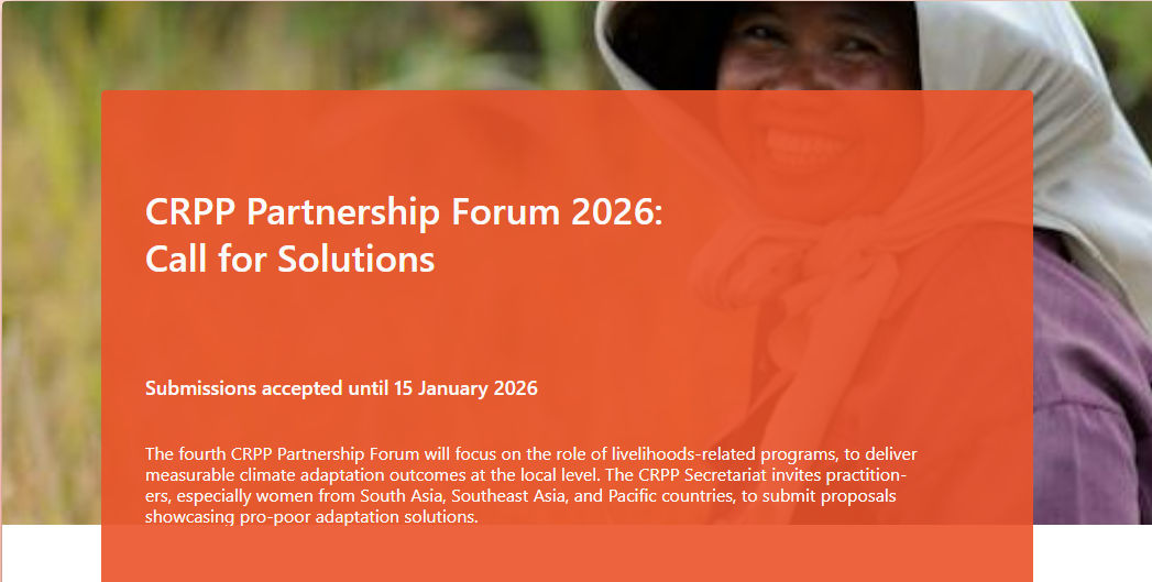The Community Resilience Partnership Program (CRPP) has opened a Call for Solutions ahead of the CRPP Partnership Forum 2026, inviting practitionersâespecially women-led and women-focused initiativesâto showcase pro-poor climate adaptation solutions from South Asia, Southeast Asia, and the Pacific.