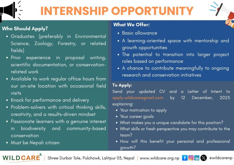 Internship Opening at Wild Care Nepal for individuals who are eager and passionate about wildlife, biodiversity and conservation.