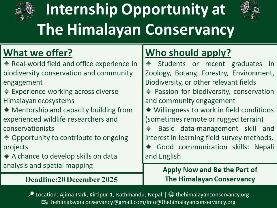 The Himalayan Conservancy (THiC) is inviting the enthusiastic students and researchers to join their conservation team as interns to work in both office and in fields.
